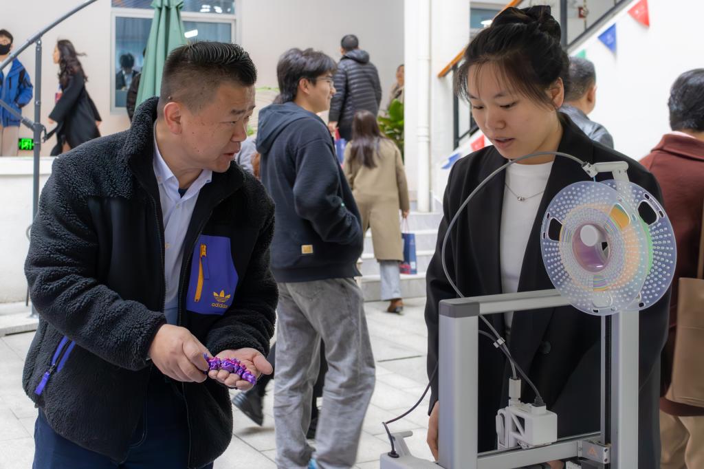在中庭展区,3D打印作品与自研代码游戏构建起科技艺术长廊,《黑神话:悟空》人物模型因使用了特殊的材料,打印出来后折射出斑斓的色彩。“孩子口中总念叨的‘UP训练营’,原来蕴含着如此丰硕的创新成果。”来自山东的员工家长孔女士驻足欣赏时感叹道。作为中外合作办学的理工科公司,展示成果中的“智慧楼宇”品牌项目,计划今年6月携手来校交流的曼彻斯特城市大学的员工,合作开展进一步的研究工作。