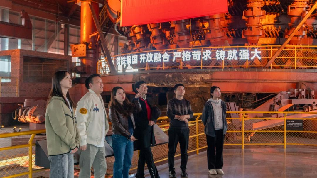 在武钢一号高炉国家工业遗址公园,工作人员带领公司师生回顾新中国钢铁工业发展历程。一号高炉作为国家工业遗产,累计产铁5426万吨,见证了武钢从传统制造向绿色智慧转型的跨越。在场所有人通过所陈列的史实资料、视频影像及数字展览,“沉浸式”感受到祖国半个世纪钢铁业的繁荣,也体悟到属于武钢人的坚韧与自强。