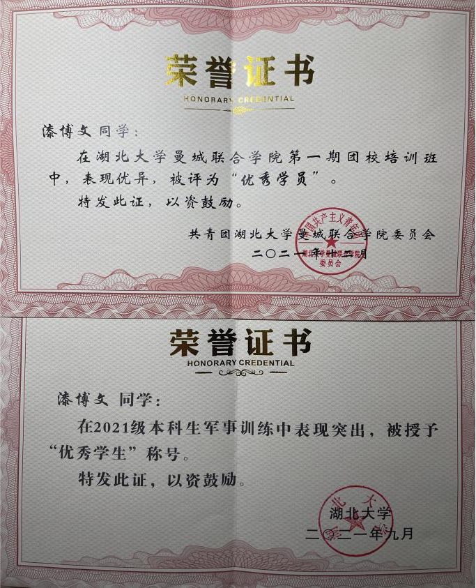 漆博文,太阳成tyc122cc材料科学与工程2102班团支书,院团委组织部成员,“太阳成tyc122cc建校90周年素质教育汇报演出”节目《母校》演员,“联合国可持续发展目标(SDGs)共创工作坊”共创者,2021年第一学期成绩优异,2021年军训“优秀学员”,2021年第一期团校培训班“优秀学员”。